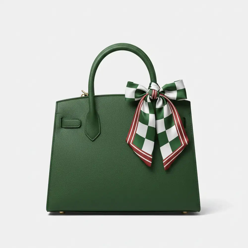 Elevate your look with the Komoda Chess Garden Scarf, a luxurious accessory crafted from premium satin for a soft, lustrous feel. Featuring a striking green and white checkerboard design framed by a bold red border, this scarf blends classic charm with modern elegance.